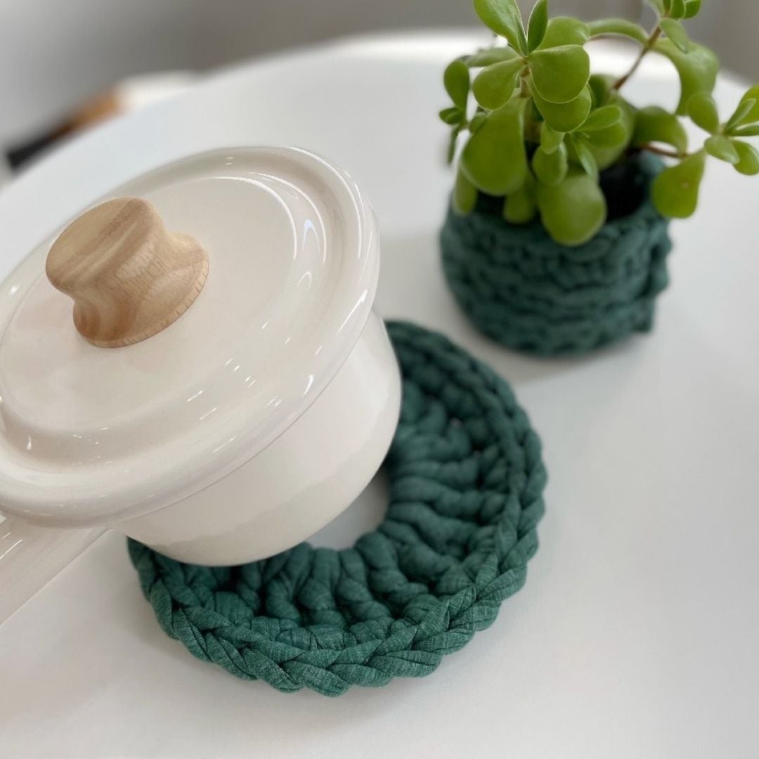手編みによって1つ1つ丁寧に仕上げたポットマットは、コットン100%で出来ているのでお手入れもしやすくお洗濯も可能です。